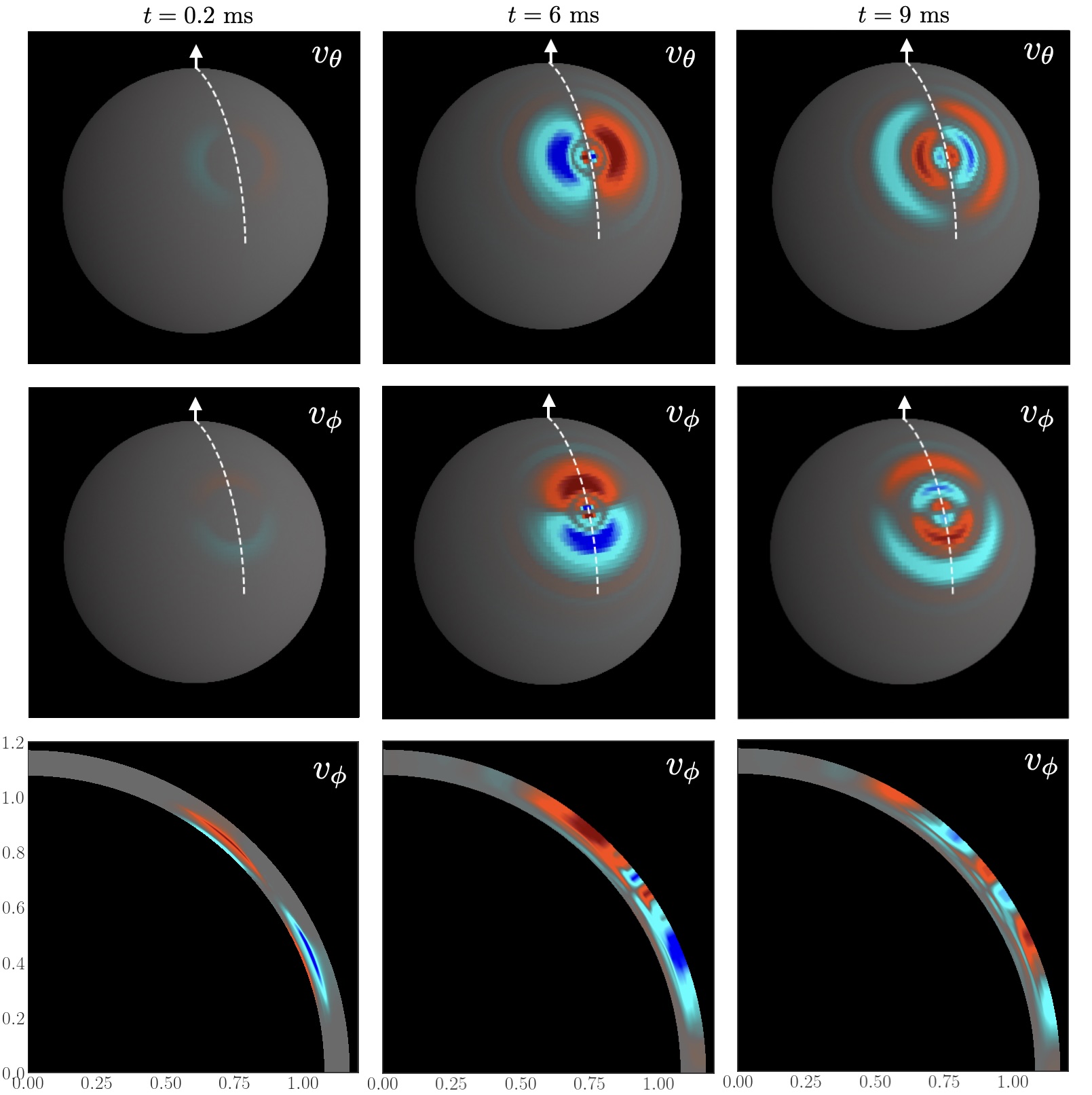The figure to the right shows fast magnetosonic waves launched from the magnetar crust quakes.